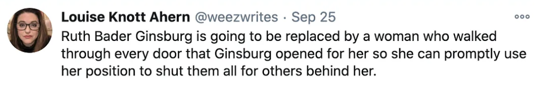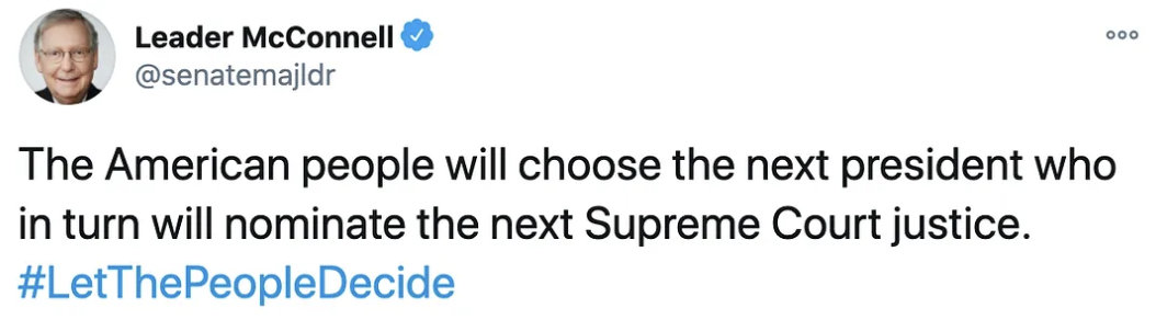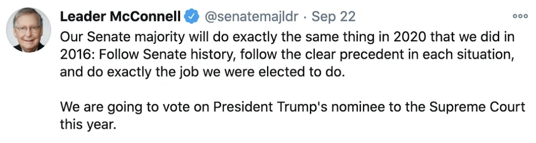 Everyone started quoting Senate Majority Leader Mitch McConnell’s 2016 tweet when President Obama nominated Merrick Garland to succeed Justice Scalia. We were all hoping he would stay true to his word during this election year as well. However, he did not. Only hours after news of Ginsburg’s death broke, McConnell said, “President Trump’s nominee will receive a vote on the floor of the United States Senate.” After receiving a significant amount of backlash, he tweeted three days later: